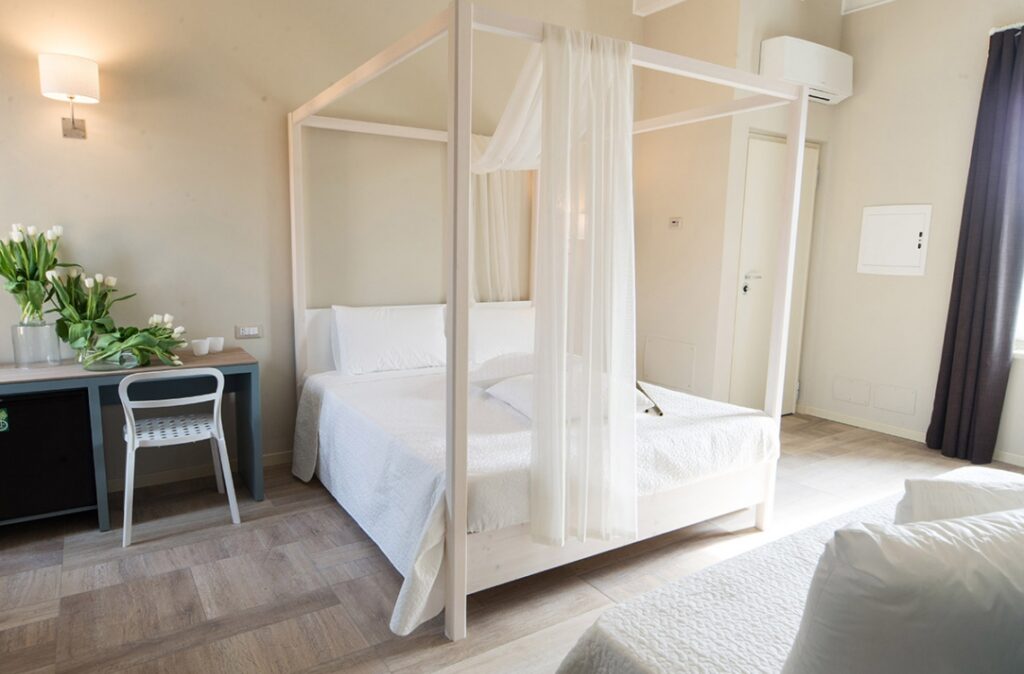 Ambienti moderni nel servizio e minimal nel gusto caratterizzano le quattordici stanze a disposizione, i mobili dal disegno moderno, sono realizzati su misura da artigiani locali e dispongono di confort di ultima generazione come televisore LCD, frigobar, cassaforte, impianto di climatizzazione estiva e invernale, sistema domotico di controllo per la riduzione dei consumi energetici ed il migliore comfort ambientale. I bagni di ciascuna camera sono dotati di ampia doccia, lavello con mobile bagno, sanitari e linea di benvenuto.